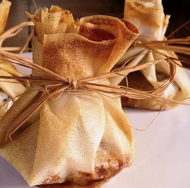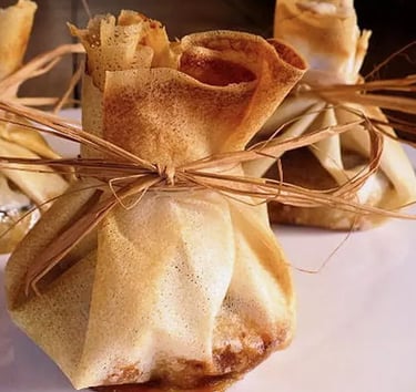 - Aumônière de magret de canard aux cèpes, velouté de foie gras à la pistache, pommes de terre rôtissoire à l'ail et tomates provençale.