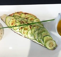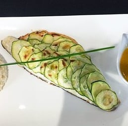 - Filet de bar en écaille de courgette rôti, sauce crémeuse aux crustacé, Tatin de légumes ratatouilles aux balsamique et risotto nature.